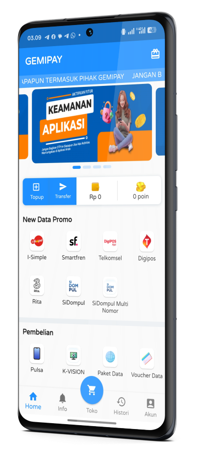 Gemipay adalah aplikasi digital untuk membeli pulsa, paket data, token listrik, dan membayar berbagai tagihan seperti BPJS, PDAM, dan lainnya secara cepat dan aman.